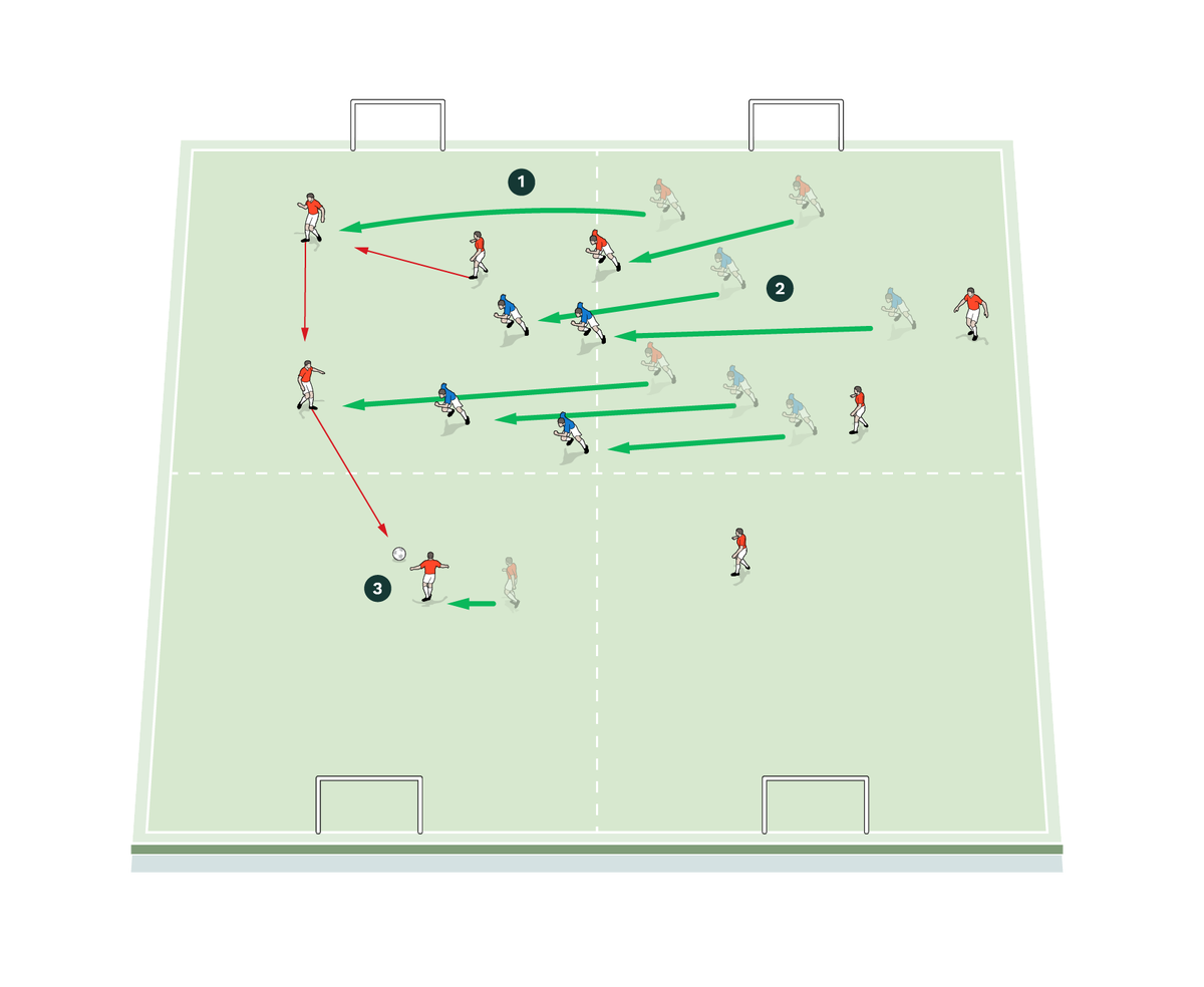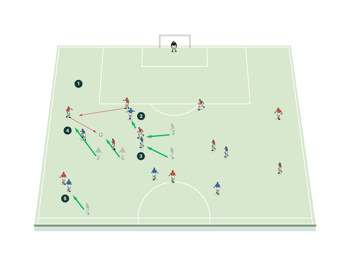 The blue player (defender) looks to win the ball and play it to a target (yellow), who recycles the ball back to the reds [2b].