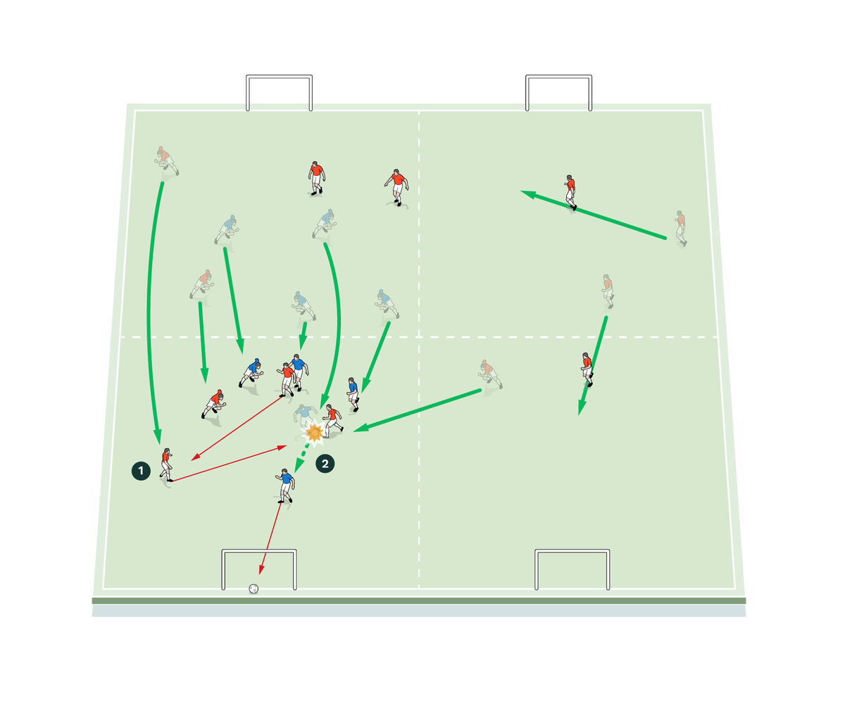 When the defending team (blues) wins the ball, they either hit the nearest target or score into the mini goal as quickly as possible [3c].