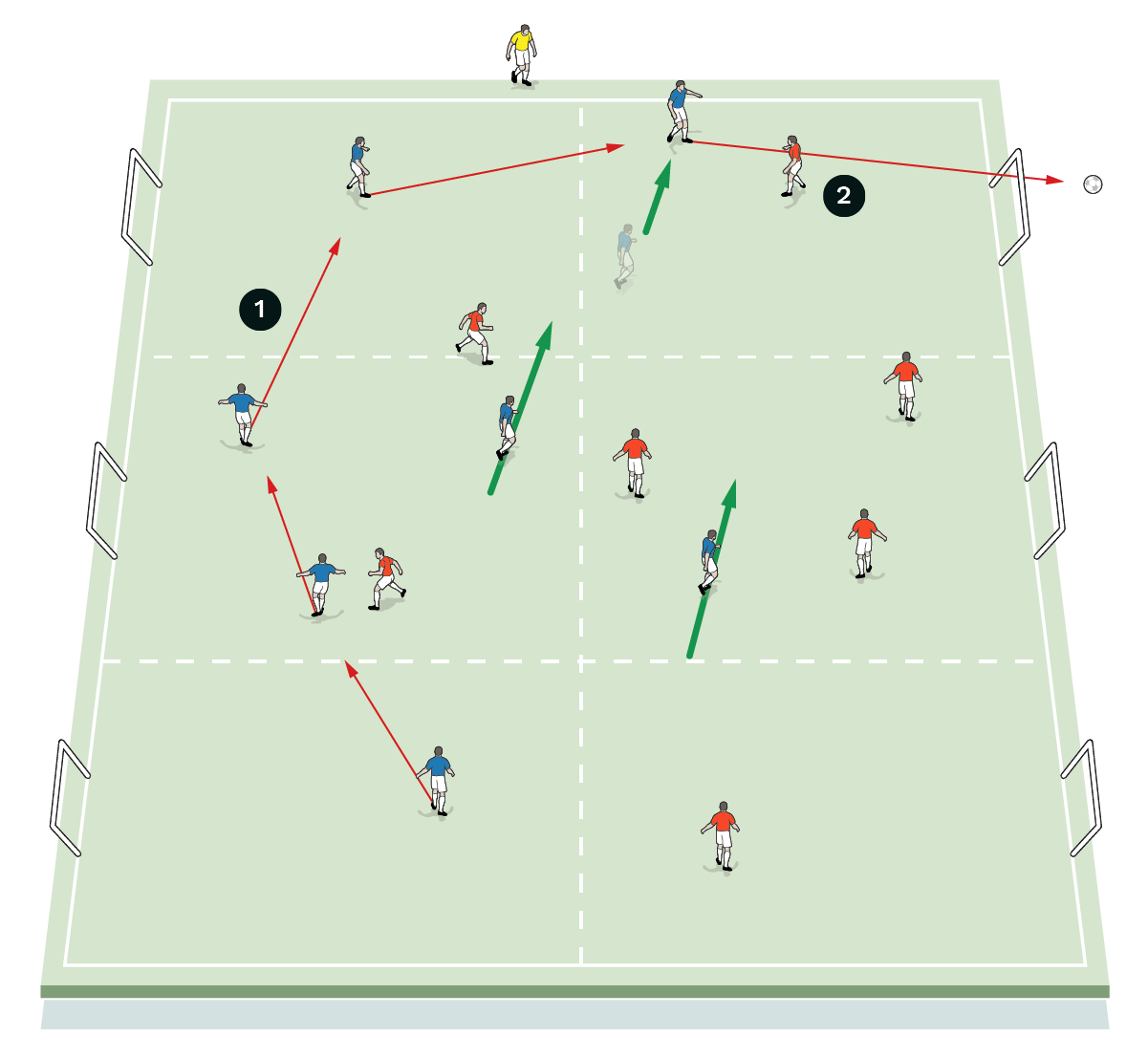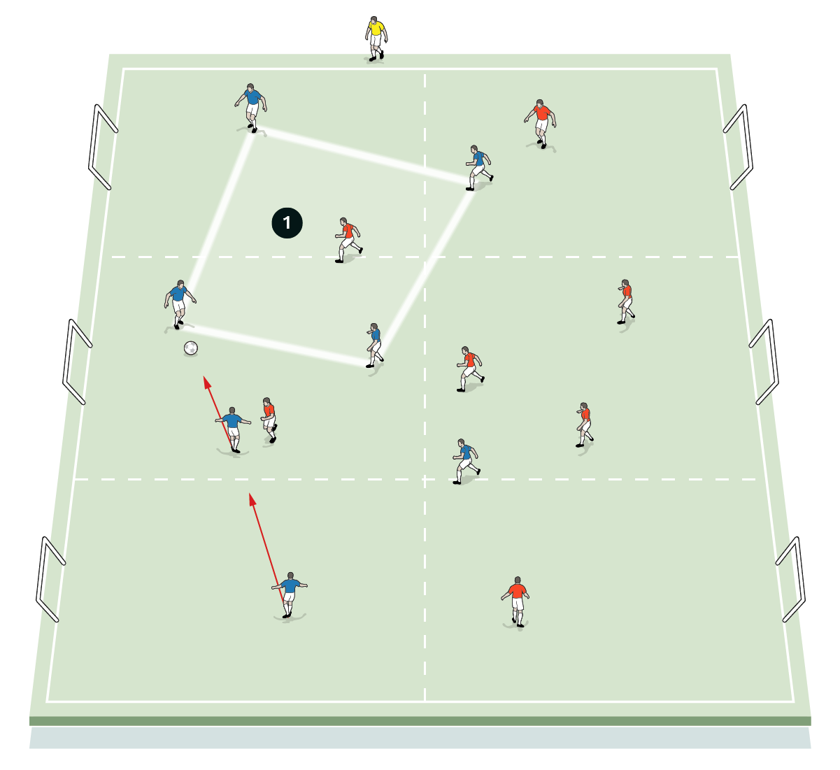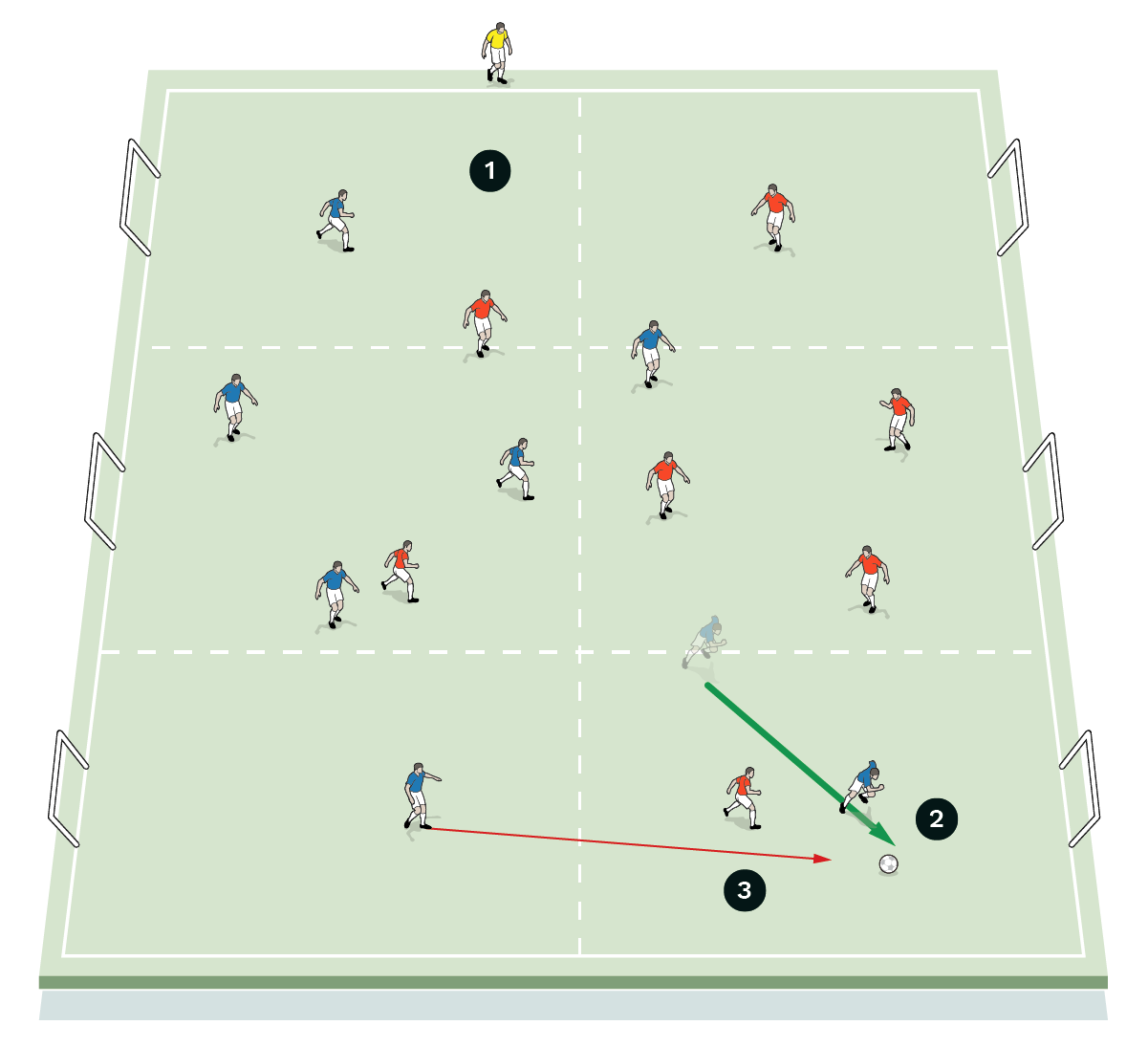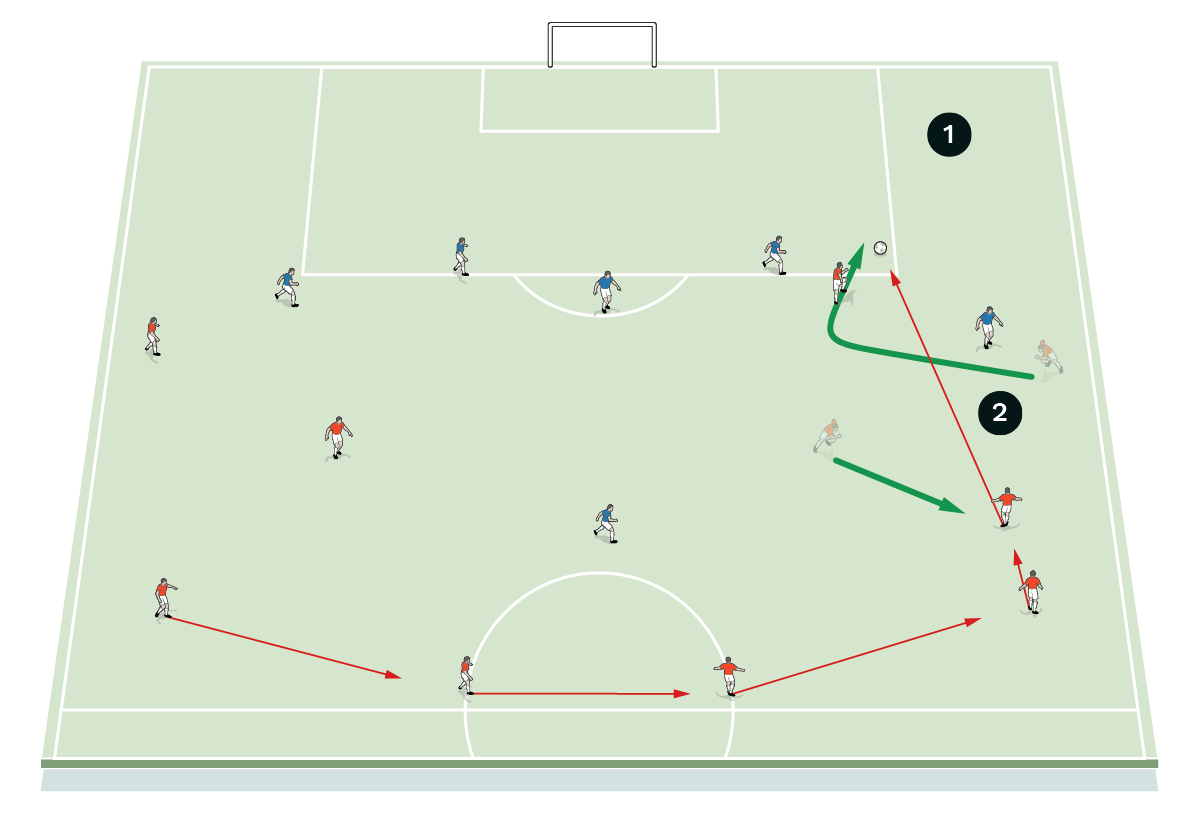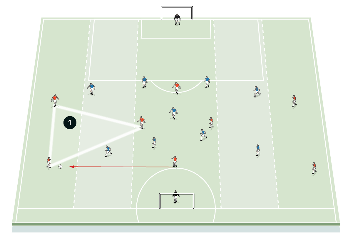 This could then be progressed to an 11v11 practice played on a three-quarter-length pitch with full width.