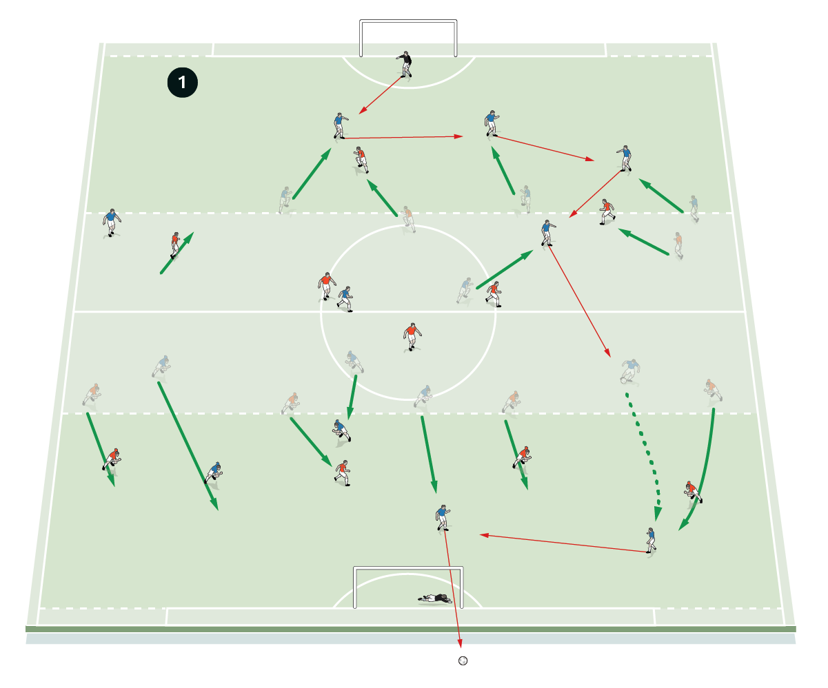 Here the intent is to find the spare player in the back third to create an overload in the middle third and move into the front third to create activity on goal. Restarts come from the coaches behind the goals into the goalkeeper, to create the problem of breaking the front third press.