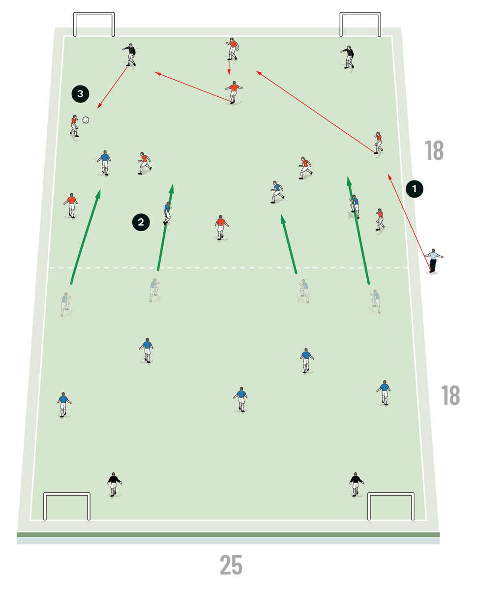 We set up in two teams, 9v9 plus goalkeepers, in a space 25m x 36m split in two halves (25m x 18m), and run four sets of two minutes with one minute of rest between.
