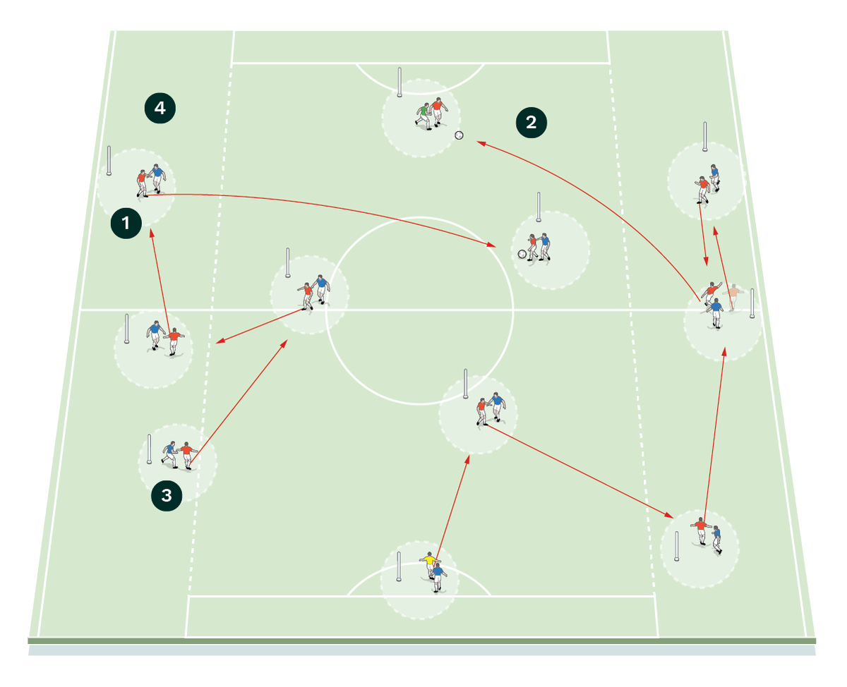 Play starts and restarts from the keepers and the red and blue teams compete to score at the end they are attacking, with the two yellow neutrals giving the possession team a 9v7 overload, as shown [4].