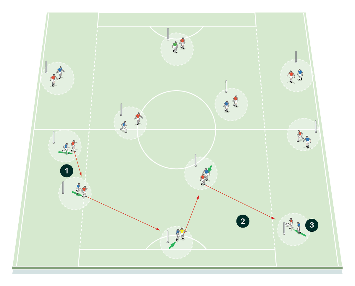 This exercise focuses on creating overloads to maintain possession. It’s effectively a 10v7 because the team on the ball always has three neutral yellow jokers to help them maintain their possession for as long as possible.