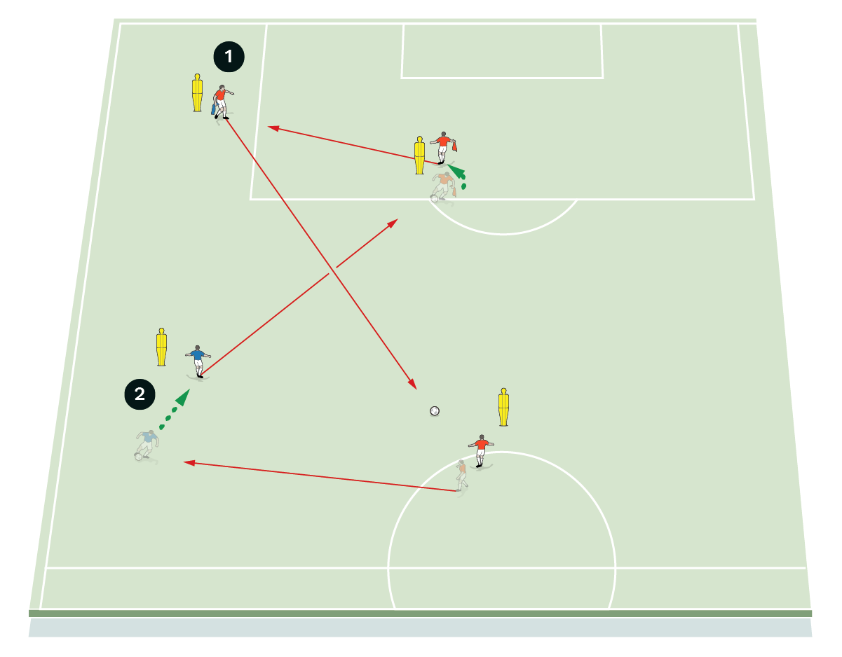 In this session, we are focusing on the 1v1 and combos, moving into the assist zone. From here we can link into one of our other attacking zones (finishing zone).