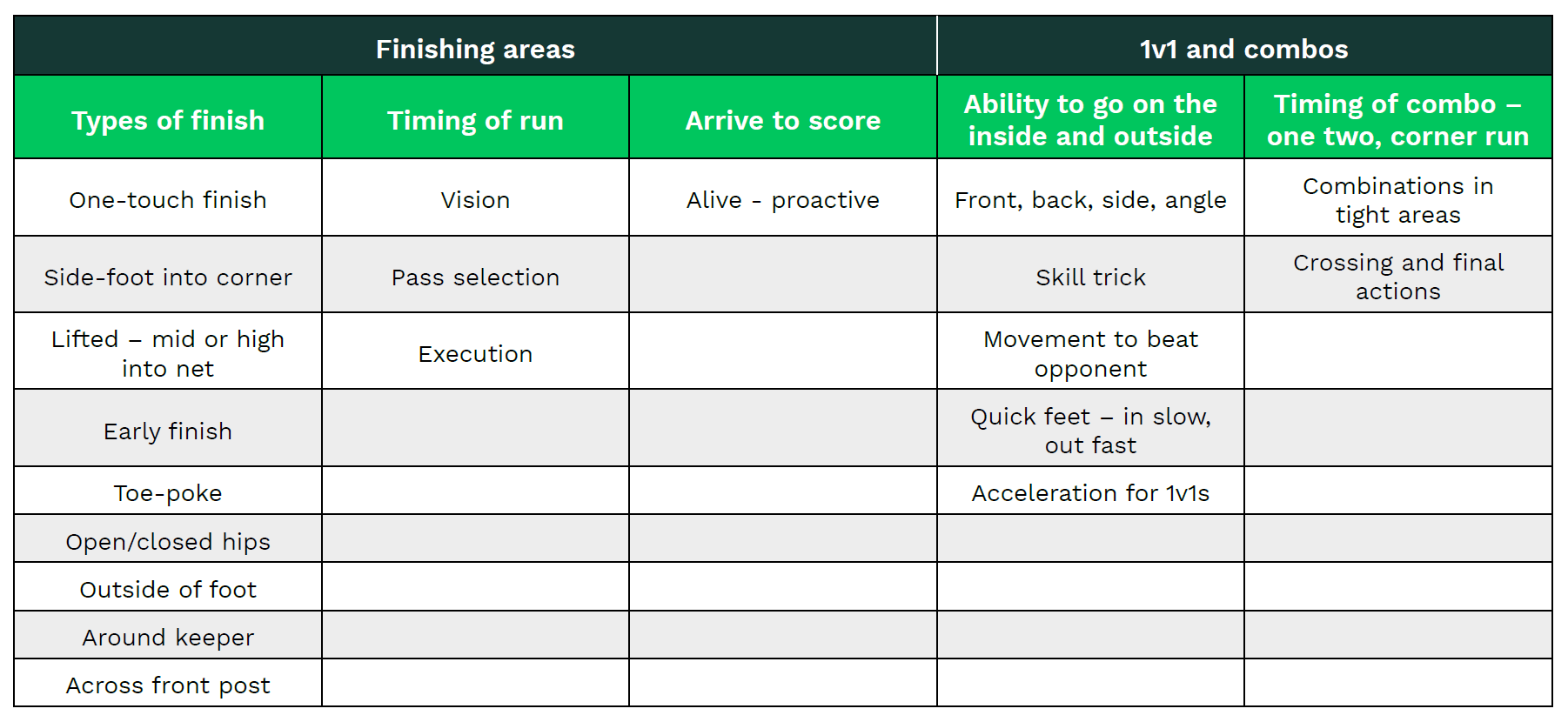 Down the wing, we are looking at 1v1 duels and combination play; as we enter the final third, we work on movement, before progressing to link up play; heading into the box, we are entering the assist zone; in front of goal is the golden zone.