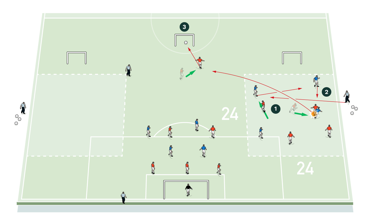 We set up on a half pitch with two 24-yard squares marked out in either corner, a goal and three mini goals set out as shown. We play 11v8, with four players from each team locked into one of the squares.
