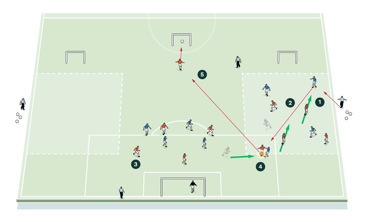 This session focuses on defending in wide areas – lanes 1 and 5 – and, should the ball get out of wide areas, defending the box. It is designed to work on combatting a team that overloads in wide areas with lots of rotations and chaos, attacks quickly, is technically proficient and has great speed and intensity.
