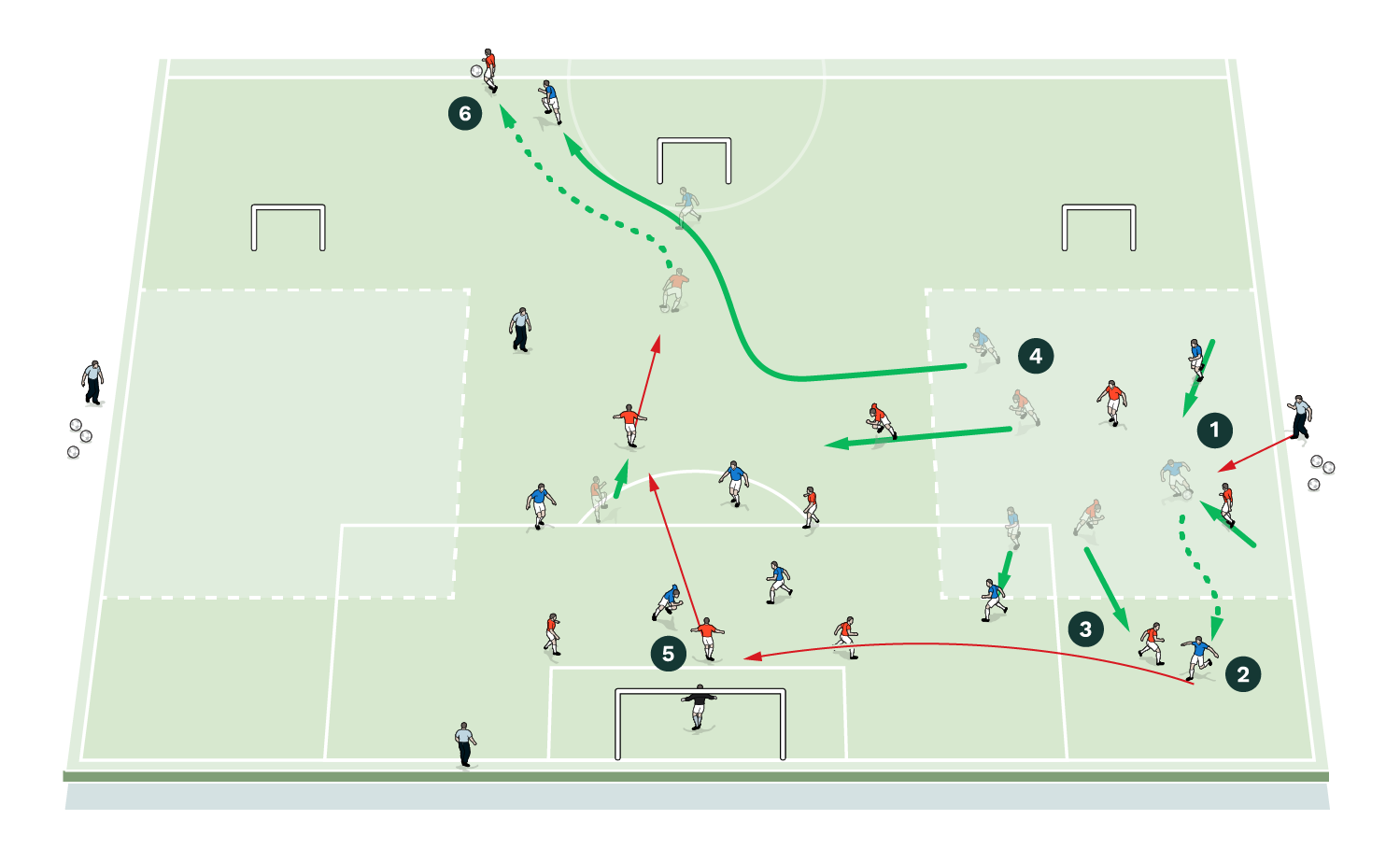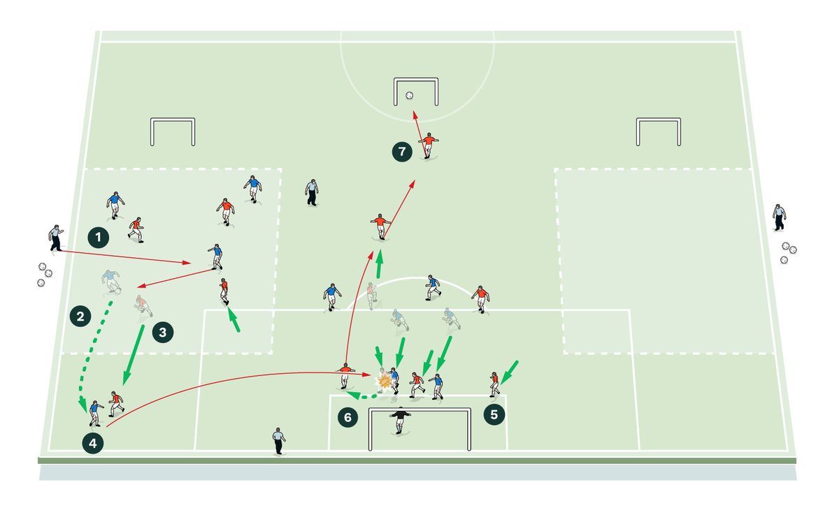 I would run this session with four coaches: one coach behind the goal, organising the box, one coach either side of the pitch, feeding balls in, and me. The co-coaching model is really important to me as an international coach. My role is to be in and around the session, observing so I can make connections and add detail to the session. Again, this comes down to the limited time we may have with the players – I need to make sure we use the time we have on pitch wisely.