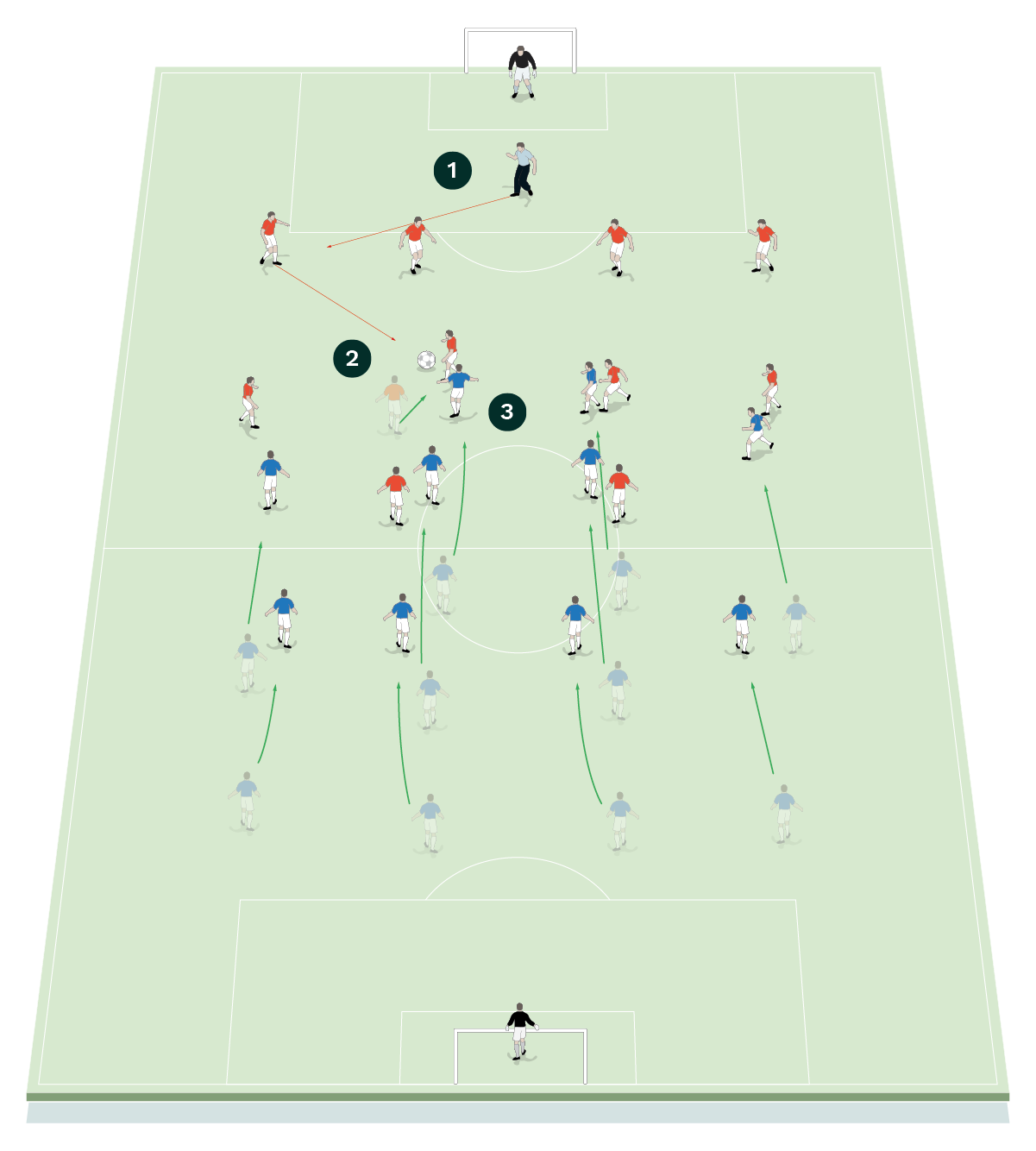 To do this all red players must shift across to create numerical advantages with the aim of winning the ball back.