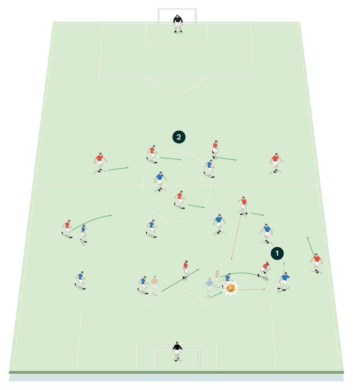 If the red team reaches the attacking half with the ball and they lose possession to the blue team, the reds must work on their reactions to losing the ball in transition.