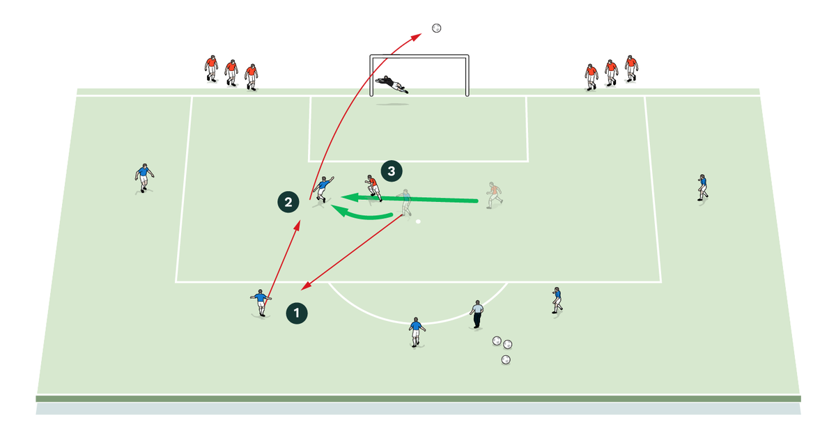This session is about the ability to get shots from inside the penalty box under intense pressure, making it as specific to a matchday situation as possible. We are training to get one- and two-touch finishes as well as headers, from 1v1, 2v2 and crossing situations. Most goals are scored in the penalty box and there are usually opponents around you, so practising when and how to shoot needs a lot of repetition, practice and dedication. The small details become the most important.