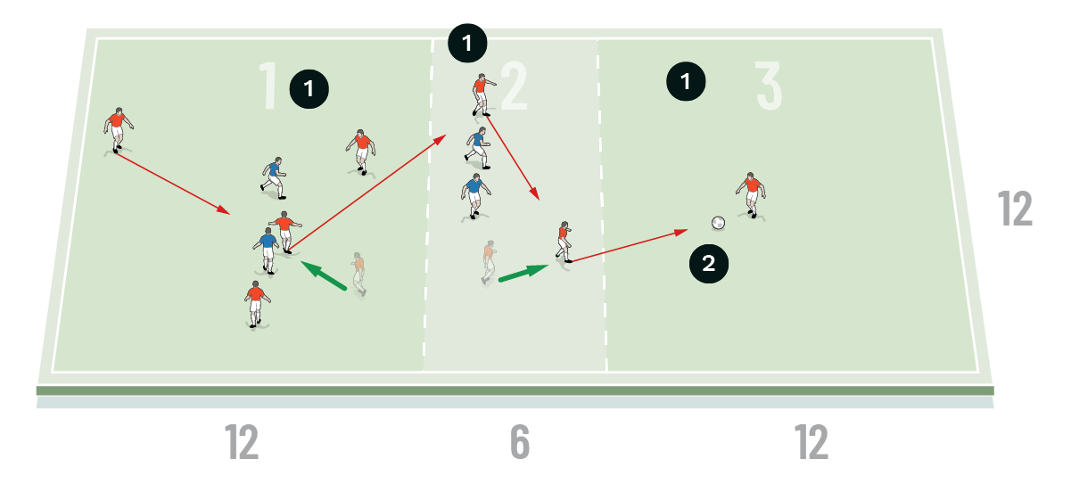 Set up in four zoned areas with the defending team only able to occupy three of them. Each unit is locked into their specific zone out of possession. The attacking team are able to occupy all zones but offside rule applies in the zone closest to the target goals. We have multiple target goals to find on initial turnover of possession [2].