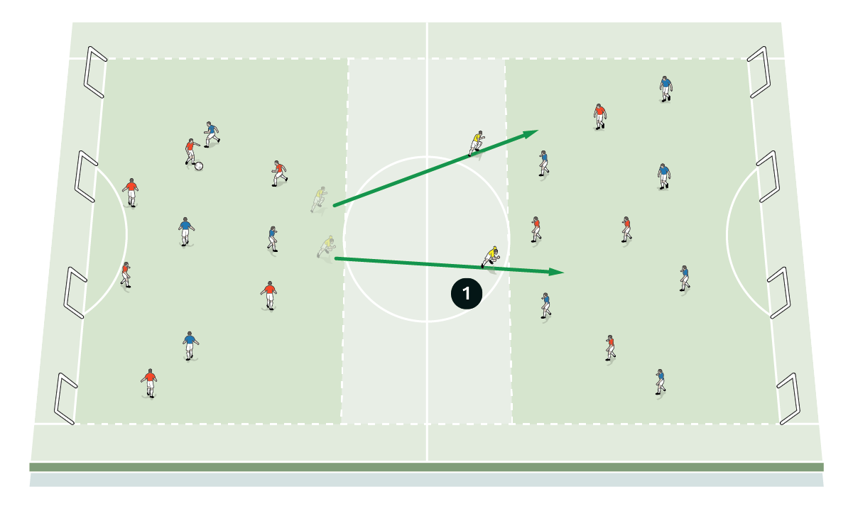 This session is about the creation of transition both in and out of possession for individuals, units and both teams. Using multiple coaches would be ideal to allow coaches roles and responsibilities to focus on a team each plus individual-focused outcomes from the session.